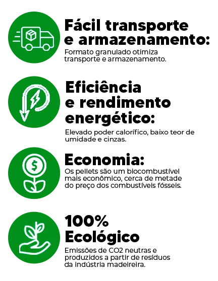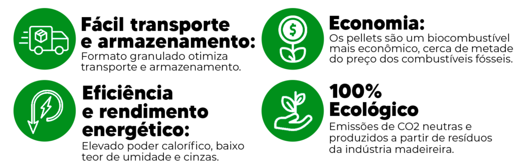 Produzidos a partir de biomassa vegetal, os pellets podem ser feitos de resíduos florestais e industriais, incluindo bagaço de cana-de-açúcar, tornando a produção ecológica e sustentável. Esses pellets oferecem alto poder calorífico, mais que o dobro da lenha e do carvão, além de baixa umidade, pouca fumaça e alto rendimento, características que atraem os consumidores.